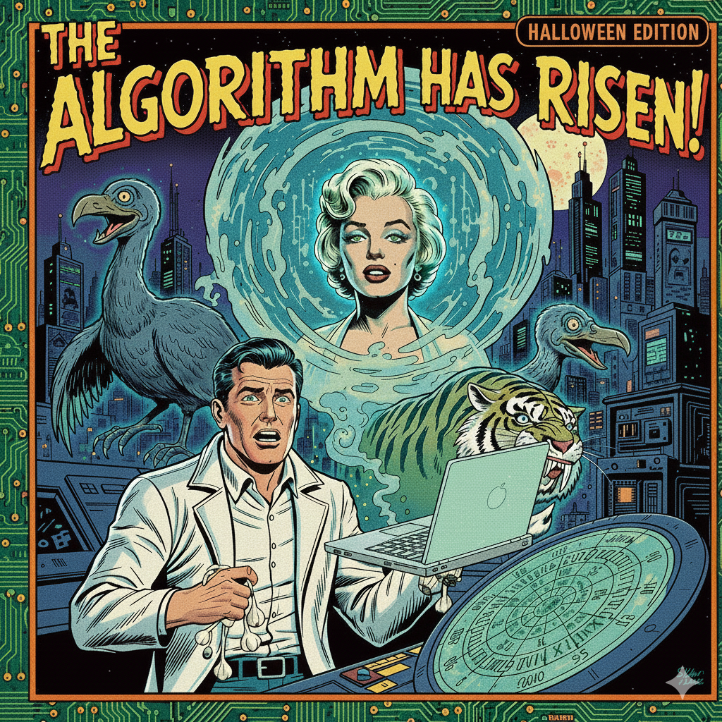 What happens when AI stops replacing the living and starts reviving the dead? In our most unsettling episode yet, we dig into the world of algorithmic resurrection—where deepfaked celebrities like Robin Williams perform scenes they never filmed, and biotech companies use CRISPR and machine learning to bring back woolly mammoths and dire wolves. From Generative Adversarial Networks creating synthetic performances to California's new laws making digital legacies licensable property, we explore the technology, ethics, and horror of consent beyond death. Is this preservation or exploitation? Tribute or digital necromancy? Join us as we ask: when the dead can be made to speak, sing, and sell - who's really in control?
